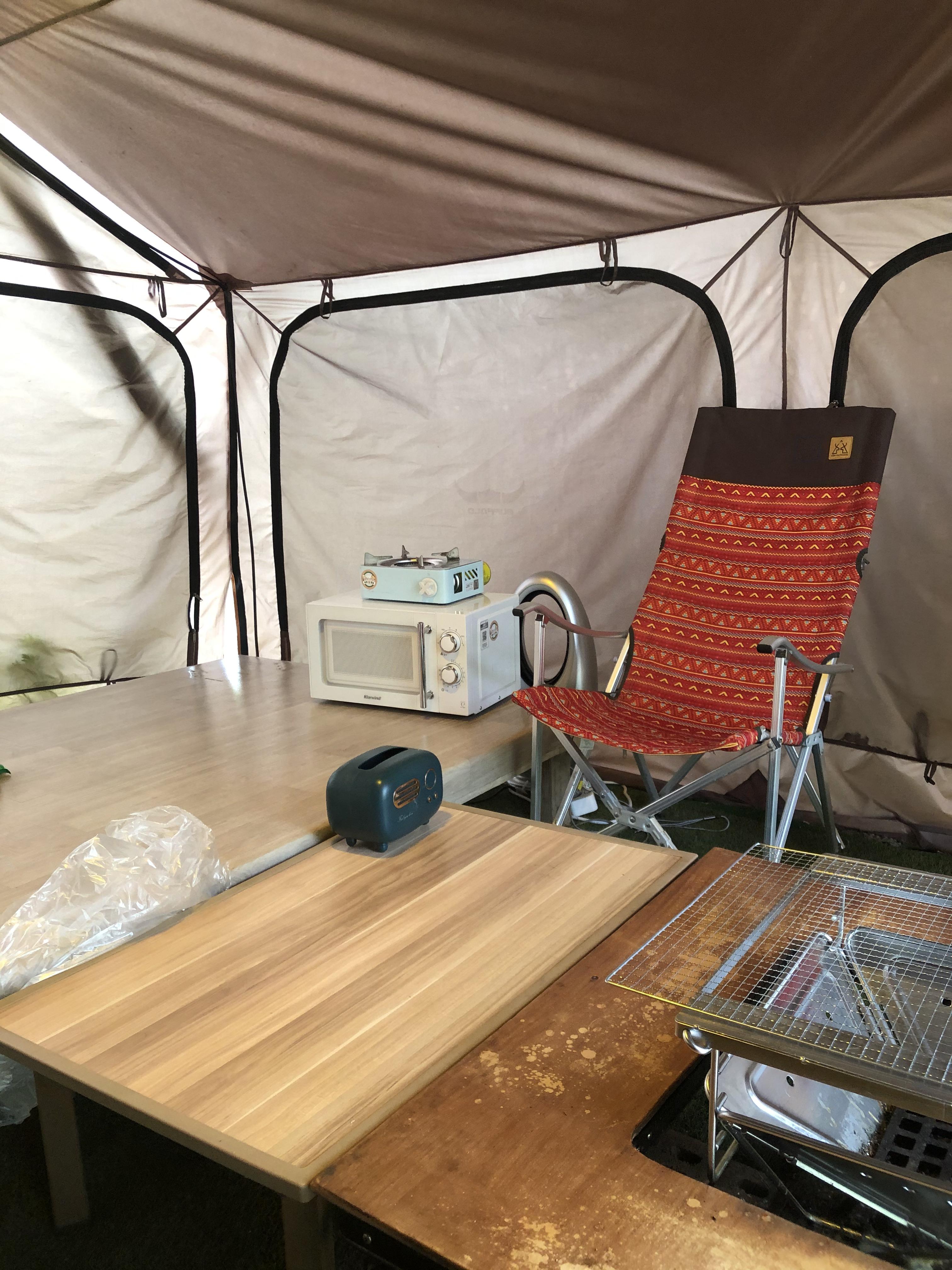 텐트는 보시는 것 처럼 그리 훌륭? 하지는 않습니다. 좋았던 점은 평상처럼 있어서 아이들이 누워서 편하게 쉴 수 있다는 점 정도입니다. 안에서 숯으로 고기를 구워먹었으나 냄새가 빠지지 않아 조금 고생을 하였으니 이 점 참고해주세요. ㅎ