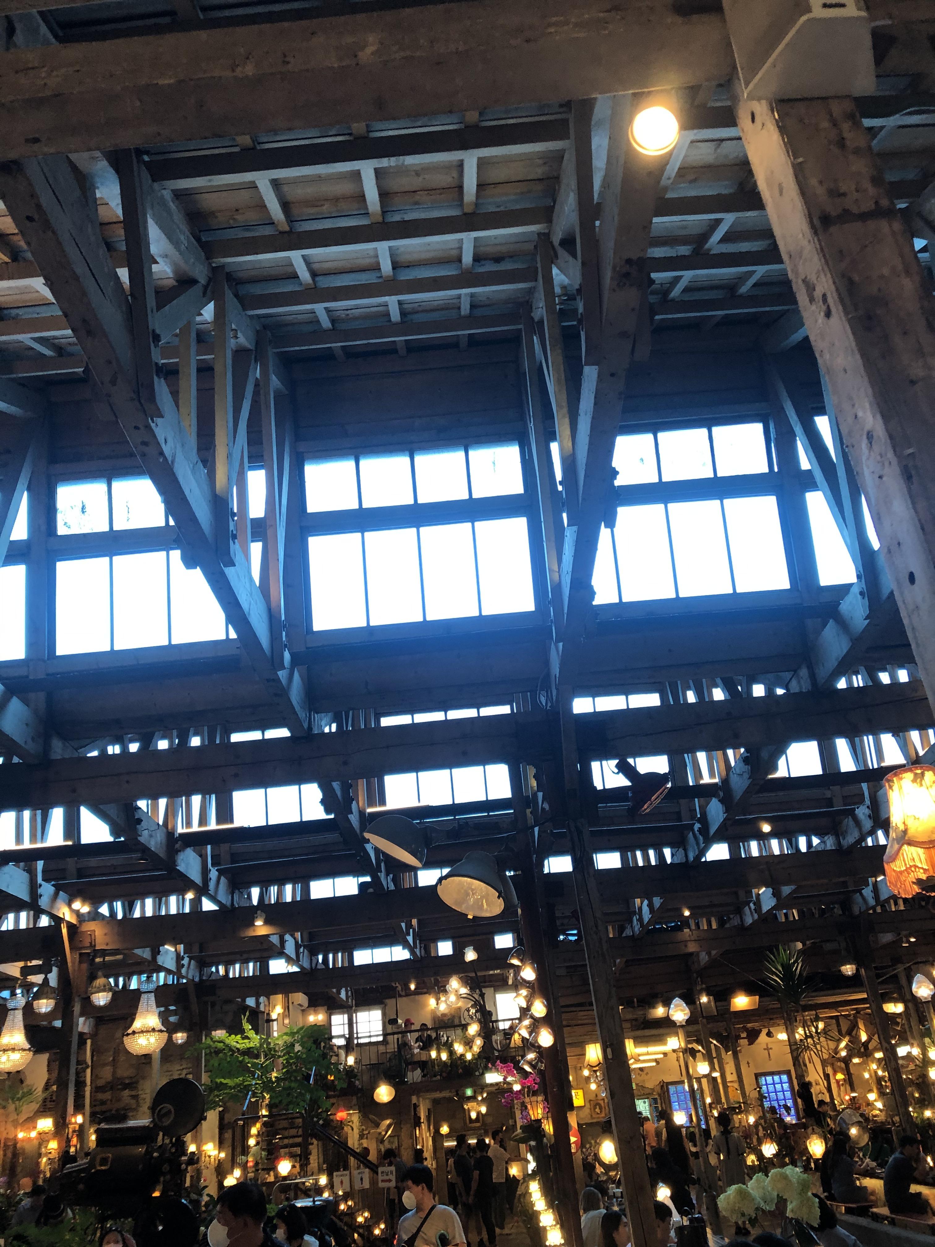 천장에 유리로 들어오는 햇살과 내부에 많은 조명들이 밝게 빛나며 묘한 조화를 이루고 있습니다. 낮이지만 밤 같은 ㅎㅎ