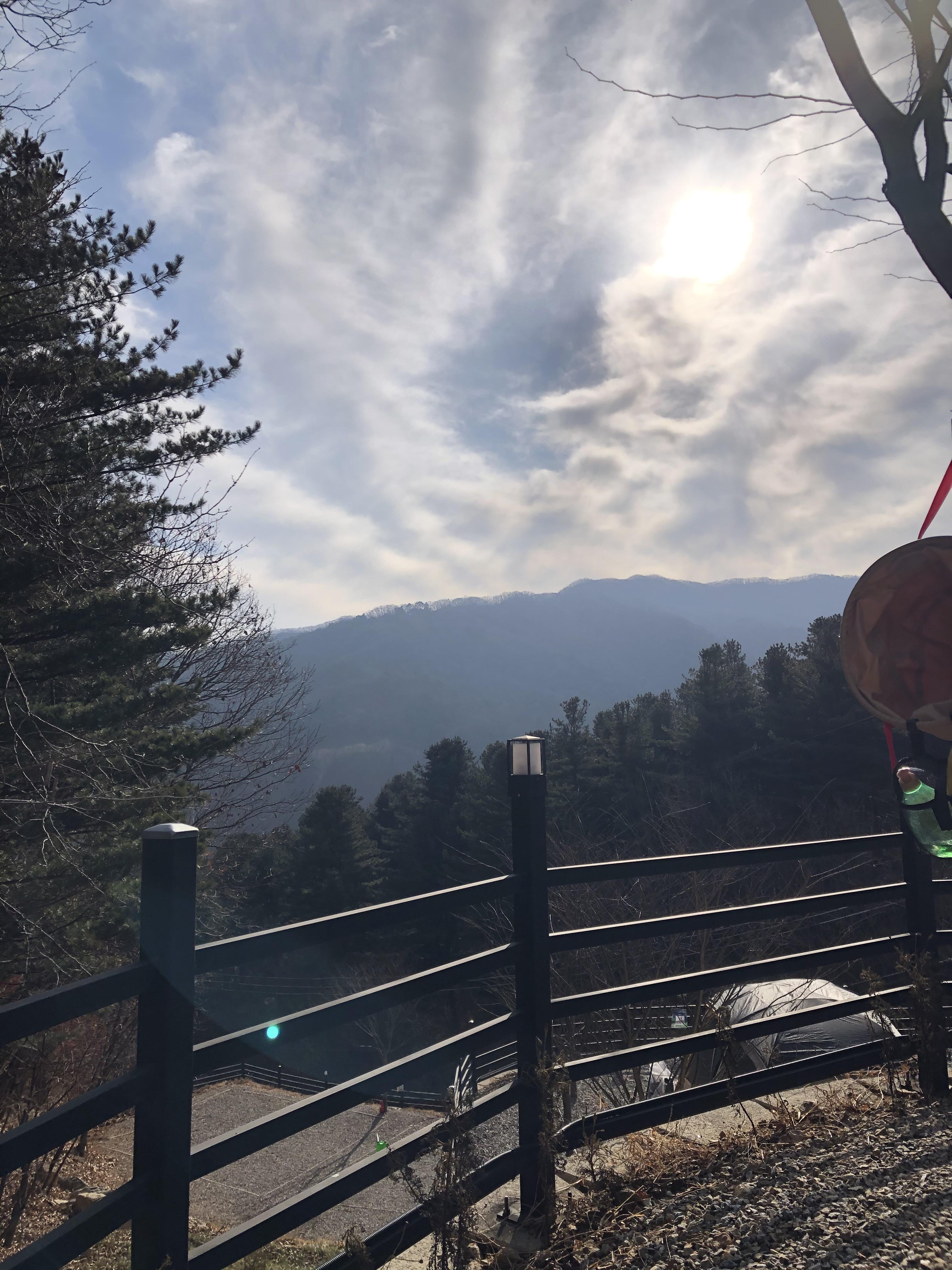 K사이트는 캠핑장으로 올라가는 중간에 만들어진 사이트라 위에 사이트들 보다 뷰가 덜 하지만 나름 시원한 뷰를 가지고 있습니다. 바로 앞에 보이는 잣나무들과 멀리 하늘과 함께 어우러진 산뷰는 화창한 날과 함께 시원한 청량감을 주기에 모자람이 없습니다.
