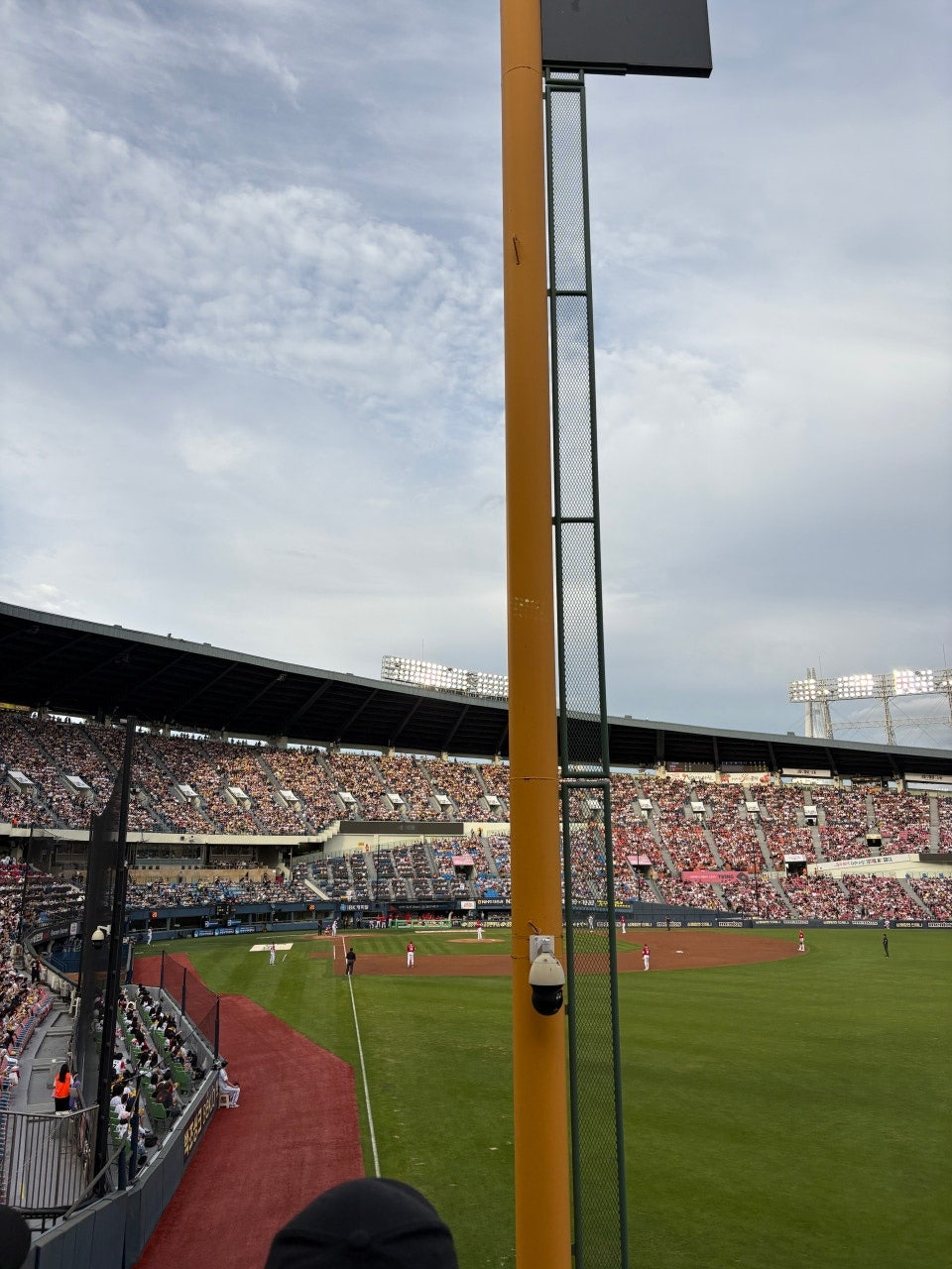 402블록은 폴대로 인해 시야 방해가 확실히 거슬리기는 하지만 전체적인 경기 관람에는 무리가 없어요. 도리어 외야 지만 응원석과 가까워 홈팀 응원을 즐길 수 있어 재밌습니다.