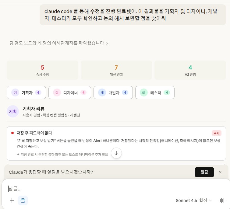 나 혼자 클로드에게 이것저것 질문하며 클로드 코드를 통해 개발을 진행하고 있었지만, 매번 혼자 하는 느낌에 팀이 필요할 것 같았습니다. 찾아보니 agent 를 여러개 만들어 역할을 주고 팀을 꾸려 프로젝트를 진행할 수 있다고 하더군요. 그래서 해봤습니다.